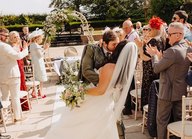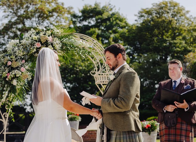 Outdoor wedding ceremony at Western House Hotel, a luxury Ayrshire wedding venue with garden backdrop